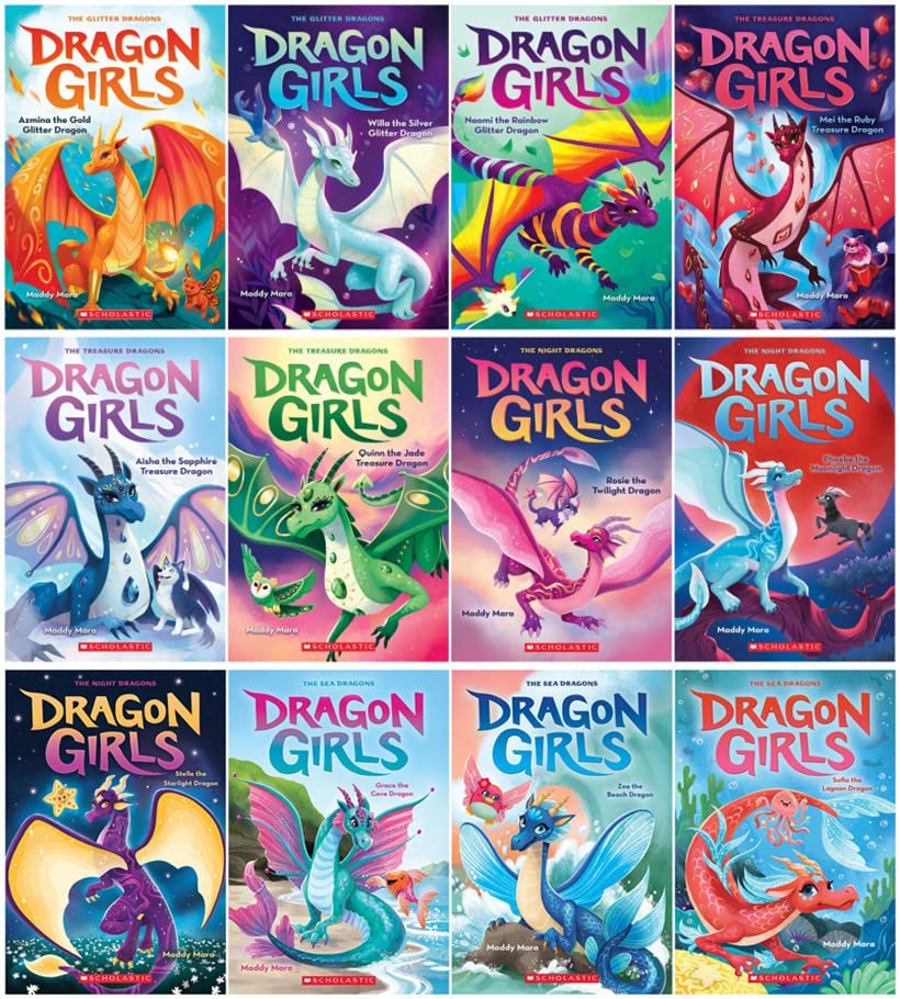This Dragon Girls Series 12 Books Set includes the following 1. Azmina the Gold Glitter Dragon 9781338680638 2. Willa the Silver Glitter Dragon 9781338680645 3. Naomi the Rainbow Glitter Dragon 9781338680652 4. Mei the Ruby Treasure Dragon 9781338680669 5. Aisha the Sapphire Treasure Dragon 9781338680676 6. Quinn the Jade Treasure Dragon 9781338680683 7. Rosie the Twilight Dragon 9781338846591 8. Phoebe the Moonlight Dragon 9781338846607 9. Stella the Starlight Dragon 9781338846614 10. Grace the Cove Dragon 9781338875485 11. Zoe the Beach Dragon 9781338875492 12. Sofia the Lagoon Dragon 9781338875508