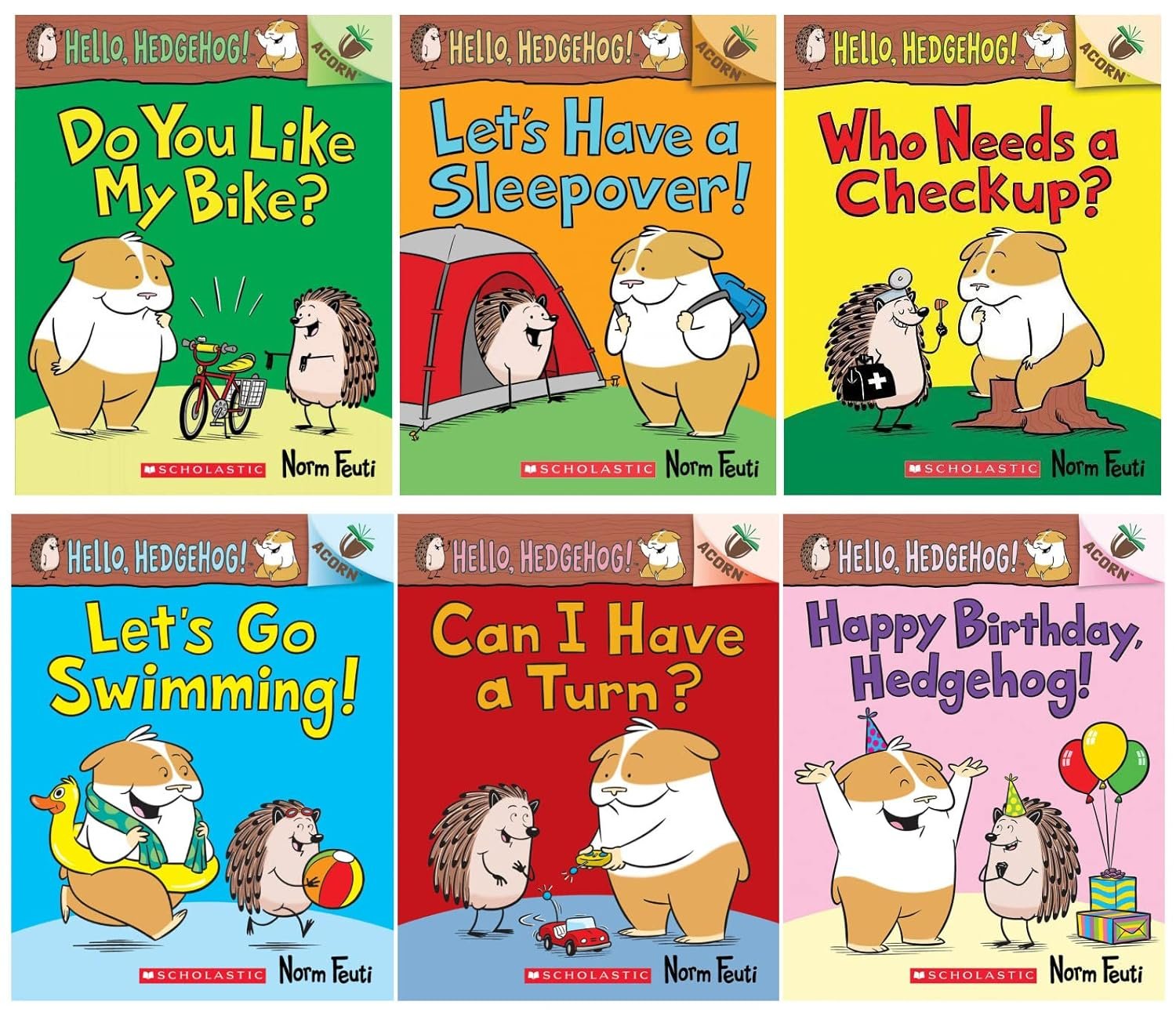 This HELLO, HEDGEHOG! Series Set includes 6 1. HELLO, HEDGEHOG! 1: DO YOU LIKE MY BIKE? 9781338281385 2. HELLO, HEDGEHOG! 2: LET'S HAVE A SLEEPOVER! 9781338281415 3. HELLO, HEDGEHOG! 3: WHO NEEDS A CHECKUP? 9781338281446 4. HELLO, HEDGEHOG! 4: LET'S GO SWIMMING! 9781338677119 5. HELLO, HEDGEHOG! 5: Can I Have a Turn? 9781338677140 6. HELLO, HEDGEHOG! 6: Happy Birthday, Hedgehog! 9781338677171