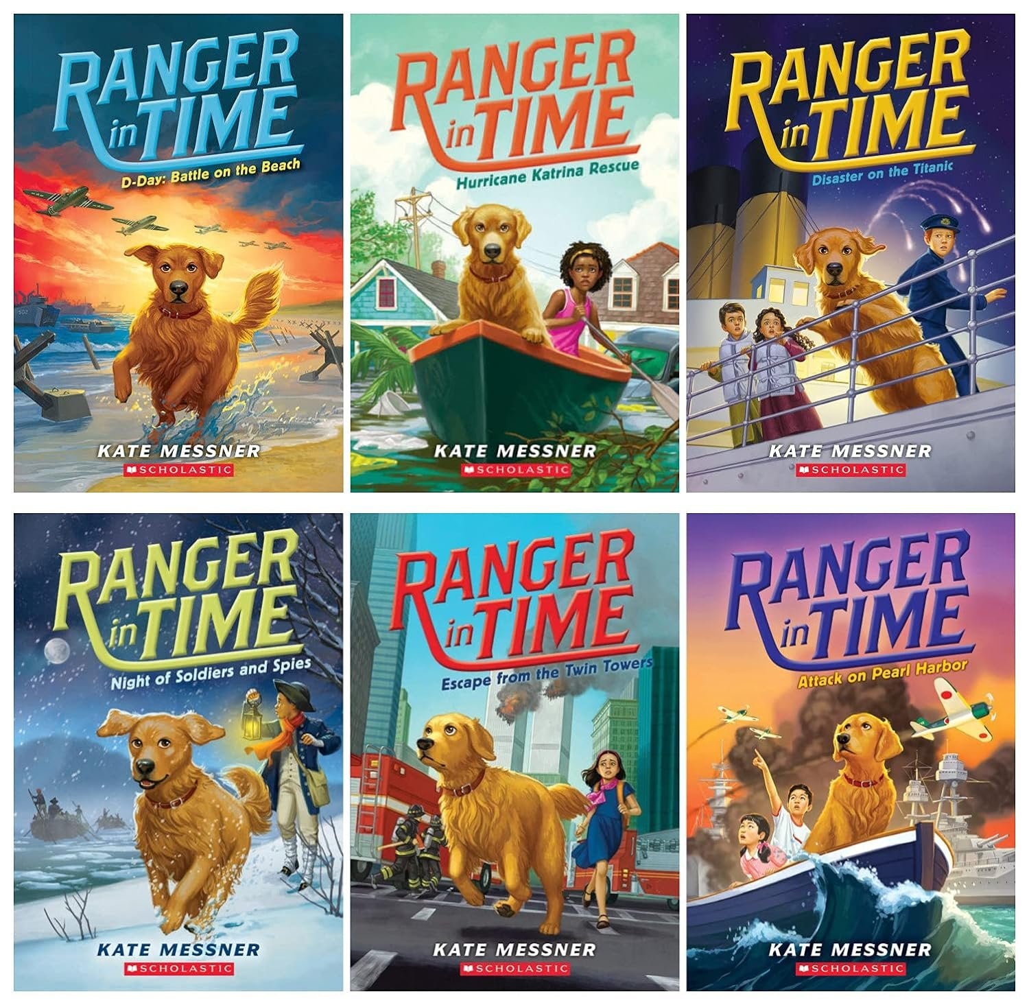 This Ranger in Time Books Set includes 6 1. Battle on the Beach 9781338133905 2. Hurricane Katrina Rescue 9781338133950 3. Disaster on the Titanic 9781338133981 4. Ranger in Night of Soldiers and Spies 9781338134018 5. Escape From The Twin Towers 9781338537949 6. Attack on Pearl Harbor 9781338537963