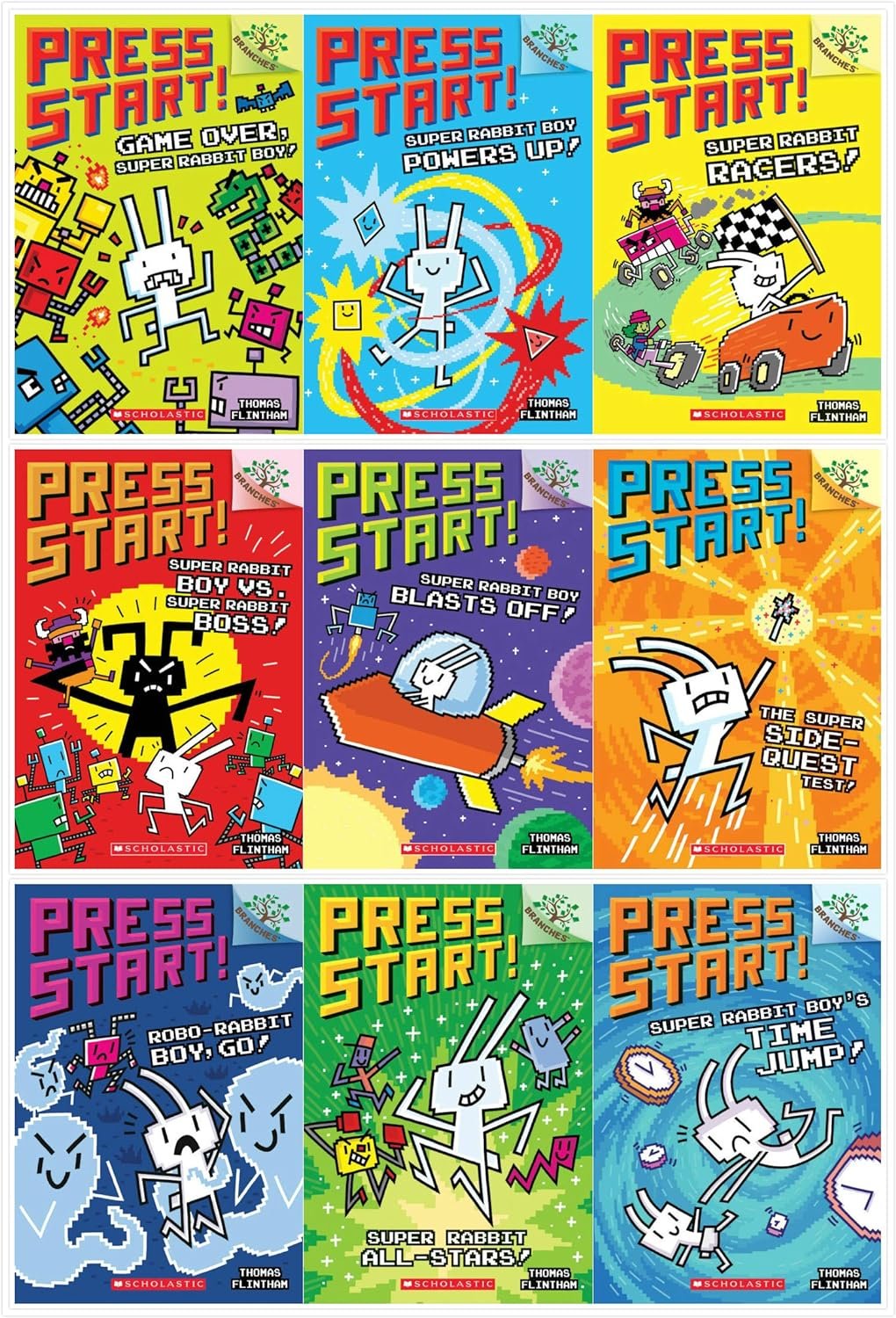 This Press Start! 1-10 Books Set includes 10 Books: 1. Game Over, Super Rabbit Boy! 9781338034714 2. Super Rabbit Boy Powers Up! 9781338034738 3. Super Rabbit Racers! 9781338034776 4. Super Rabbit Boy vs. Super Rabbit Boss! 9781338034752 5. Super Rabbit Boy Blasts Off! 9781338239621 6. The Super Side-Quest Test! 9781338239782 7. Robo-Rabbit Boy, Go!: A Branches Book 9781338239812 8. Super Rabbit All-Stars! 9781338239843 9. Super Rabbit Boy’s Time Jump! 9781338568967 10. Super Rabbit Boy’s Team-Up Trouble! 9781338568998