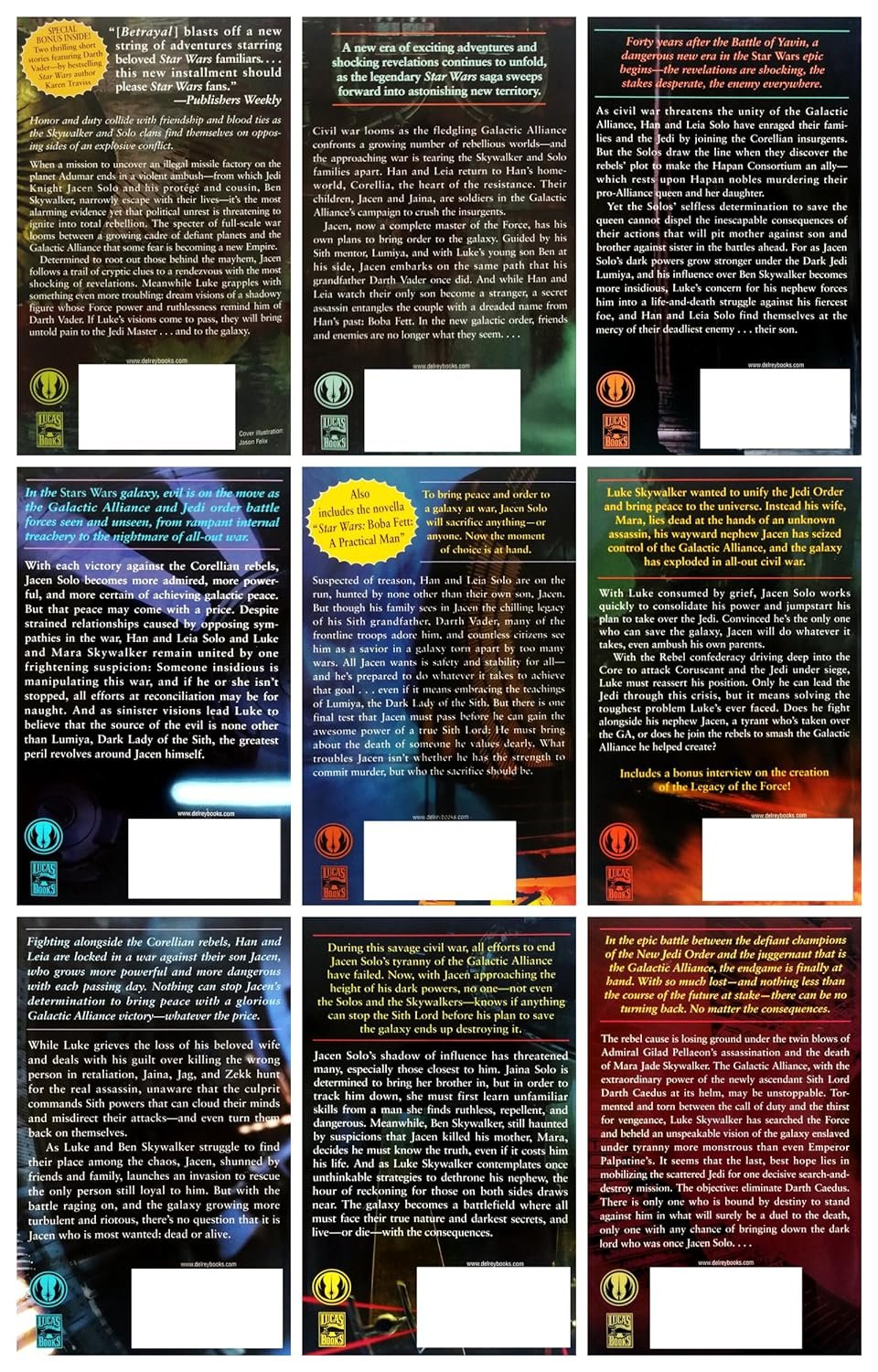 A new era of exciting adventures and shocking revelations unfolds, as the legendary Star Wars saga sweeps forward into astonishing new territory. Legacy of the Force also known as LOTF, is a 9-book series contained in the Legacy era, set five years after the events of the Dark Nest Crisis. Honor and duty collide with friendship and blood ties as the Skywalker and Solo clans find themselves on opposing sides of an explosive conflict. It deals with the fall of Jacen Solo to the dark side of the Force, mentored by the returning villain Lumiya. The backdrop to this story arc is the conflict between Corellia and the Galactic Federation of Free Alliances, which later erupts into a full-scale war. The books are written in a cycle of Aaron Allston, Karen Traviss, Troy Denning repeated three times, with Denning finishing the series with the ninth novel, Invincible.